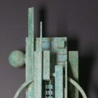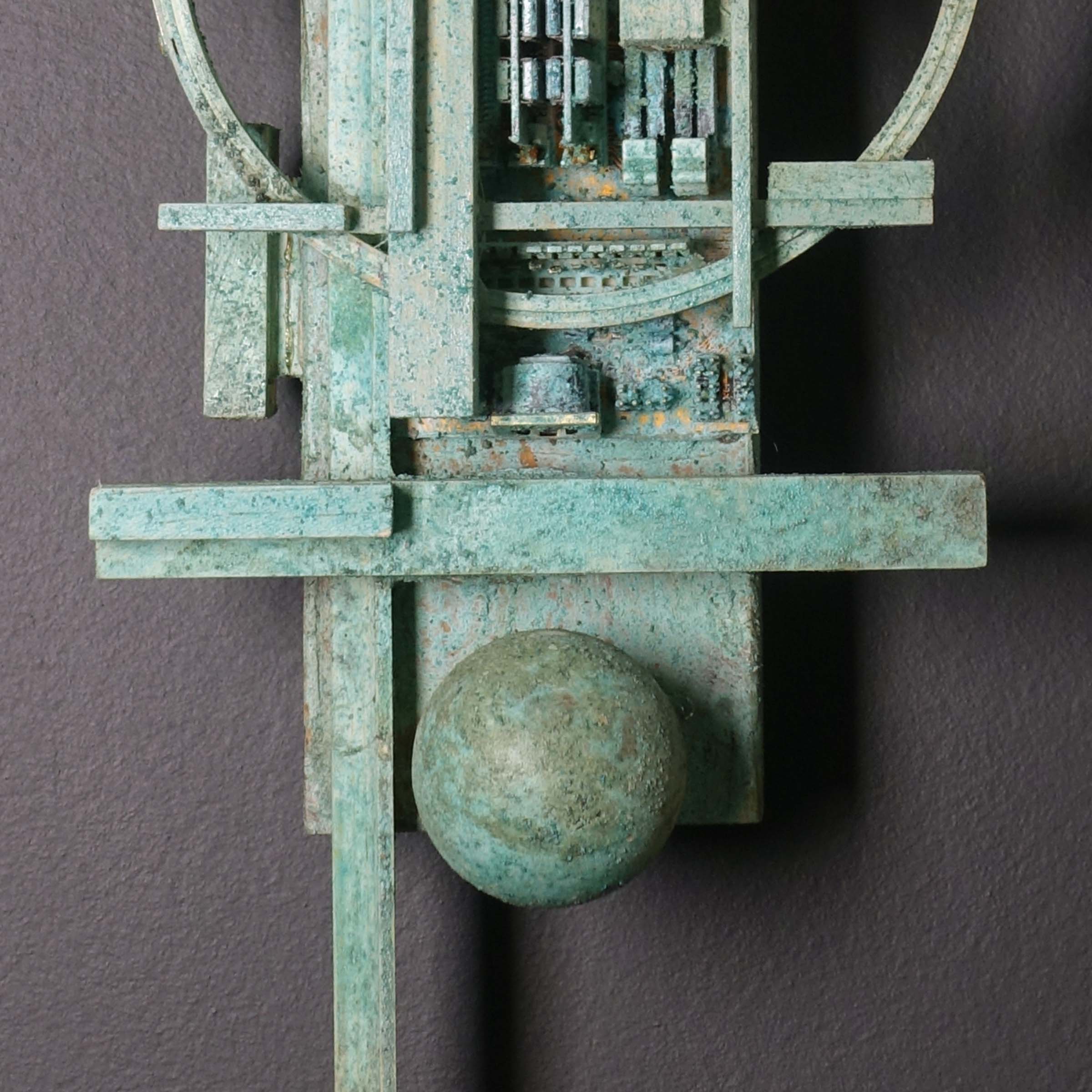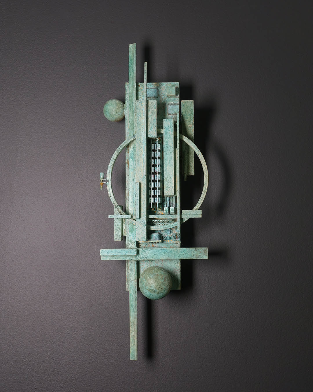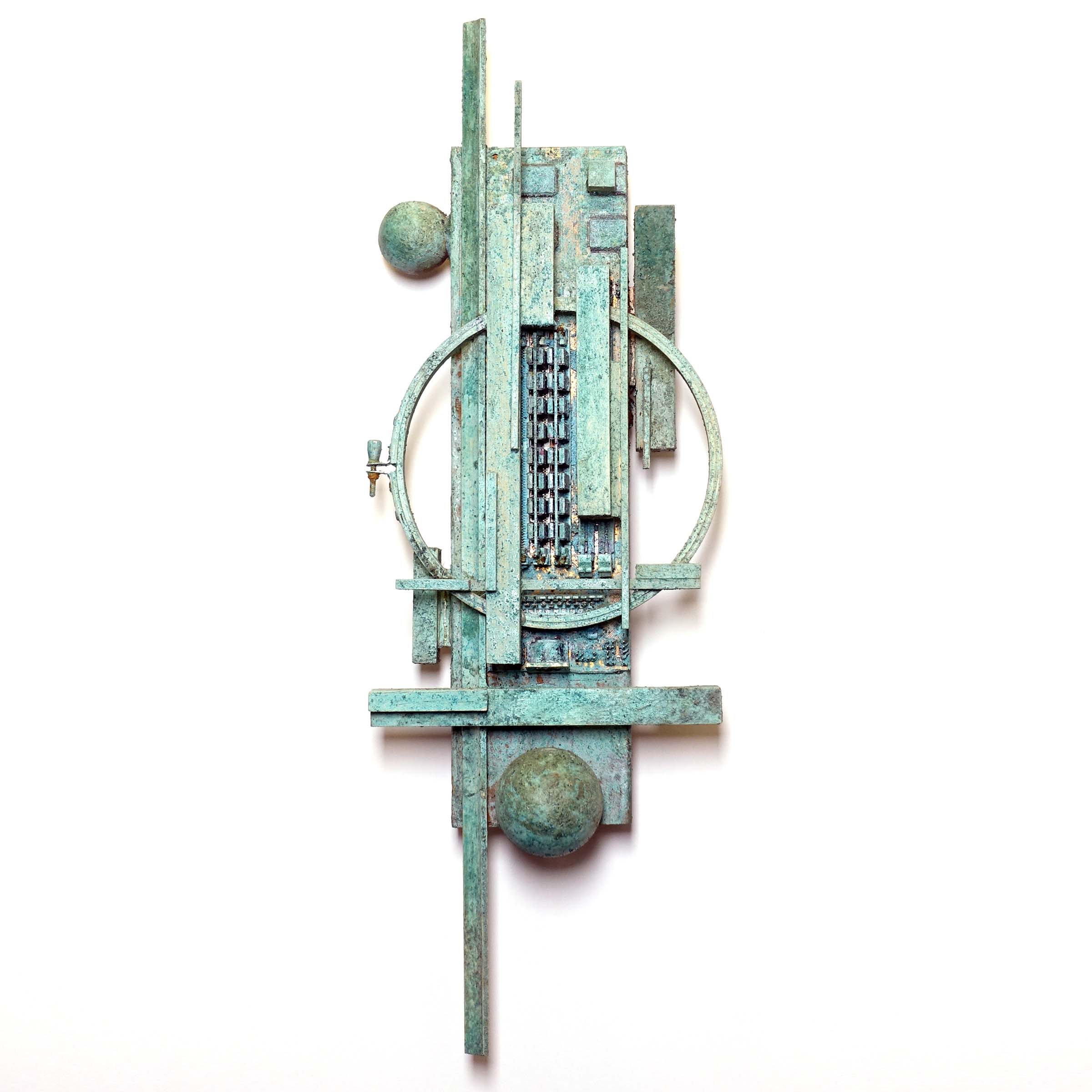 We’re thrilled to represent Lawrence Saul Heller. His intricate modernist relief sculptures are reminiscent of the best Mid-Century abstract works. This piece, created in 2018, is a mixed media assemblage comprised of wood, computer parts, and other industrial cast-offs. It is finished in a matte verdigris textured paint. It measures 21 inches tall × 7 wide × 4 deep. Fabulous.