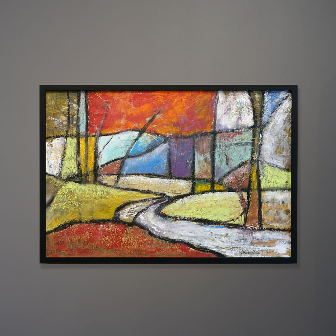 Offered here is a very large and wonderfully bold semi-abstract landscape in oil on linen. The artist, Diane Hulse, created this work in 2006. She has shown her work on the North Fork and is a resident of New York City. It is 29 x 41 framed in black wood.