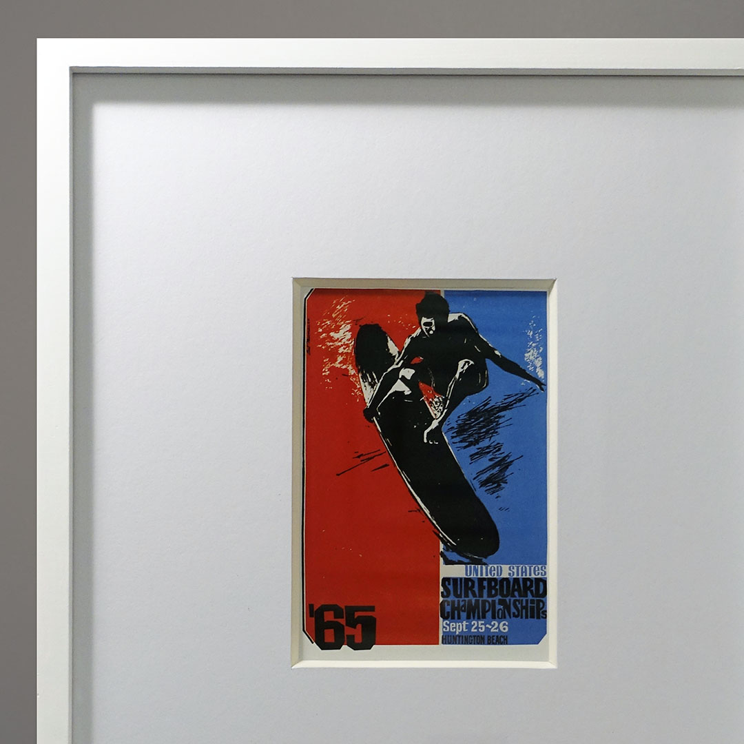 Surfboard Championship Postcard: Great 1965 movie promotional postcard featuring a hard-edge painting of a surfer dude in bold red, black, and blue colors. Hand drawn type. This is a lithographic reproduction, not the original. It is framed in white with an 8-ply archival mat. 4 × 6 in. card in a 10 × 12 in. frame.