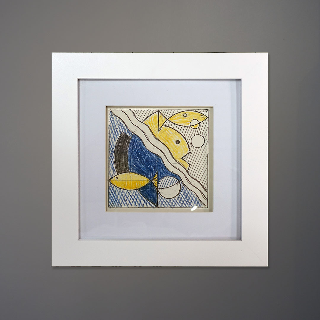 Roy Lichtenstein preliminary sketch for “Modern Painting with Fishes,” 1967. This is a vintage offset reproduction, printed in Switzerland. The original sketch is in a private collection. Ten inches square as framed.