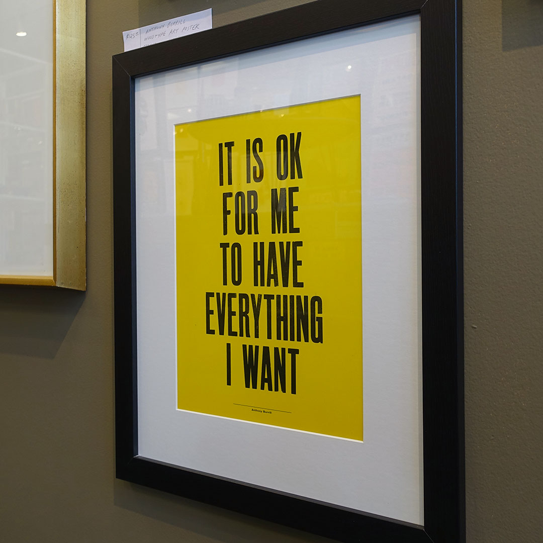 Offered here is an unsigned but original Anthony Burrill woodtype poster 11 x 14 in a 16 x 20 black frame with a white bevel cut mat. Graphic artist, print-maker and designer Anthony Burrill is known for his persuasive, up-beat style of communication. His work is held in the permanent collections of the Victoria and Albert Museum in London, the Cooper-Hewitt National Design Museum, New York and has been exhibited in galleries around the world including the Barbican Art Gallery, the Walker Art Center and the Design Museum, London. Words and language are an important part of Burrill’s output and he has developed a distinctive voice that is sought after not only by collectors of his posters and prints but also by clients including Apple, Google, Hermés, the British Council, London Underground and the Design Museum.