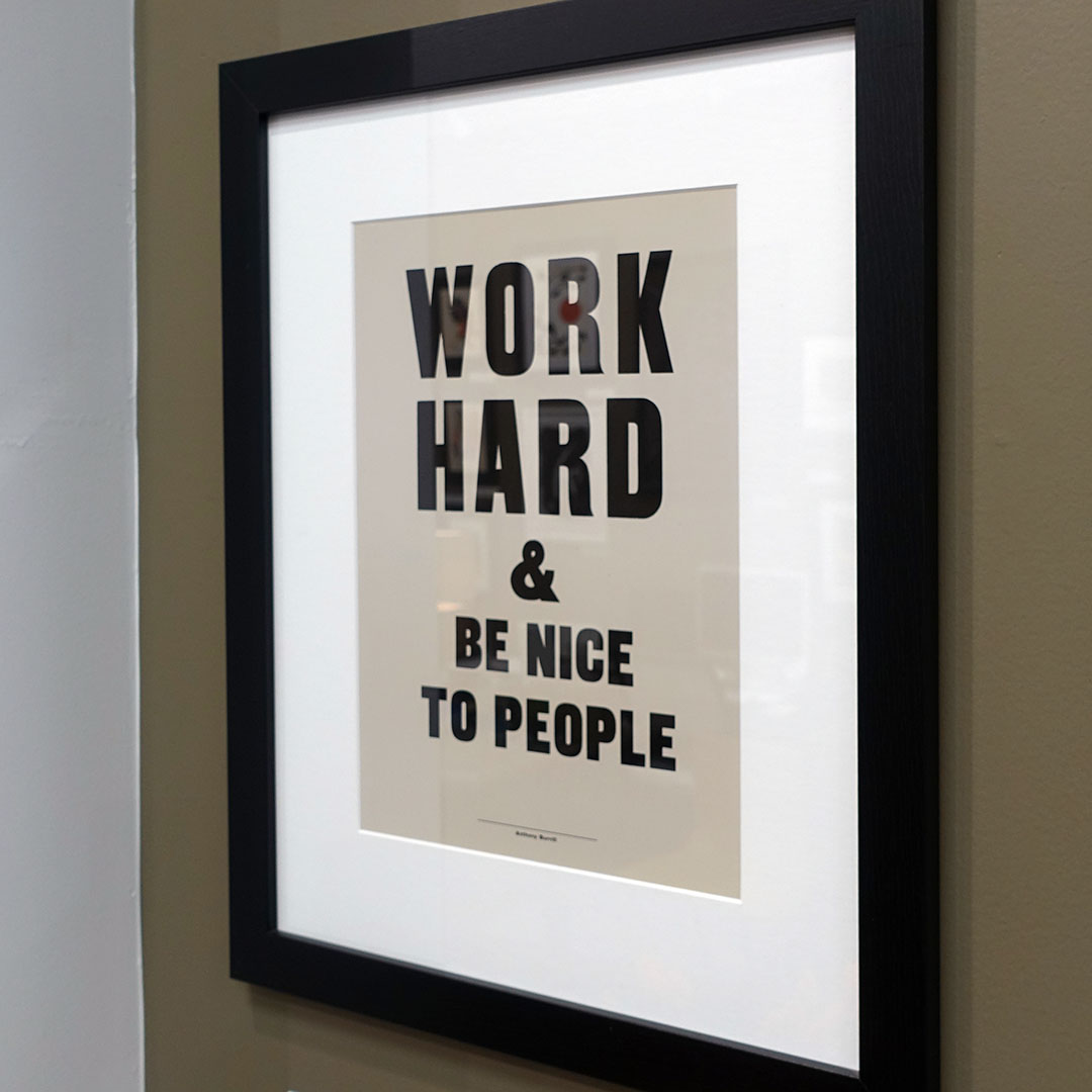 Offered here is an unsigned but original Anthony Burrill woodtype poster 11 x 14 in a 16 x 20 black frame with a white bevel cut mat. Graphic artist, print-maker and designer Anthony Burrill is known for his persuasive, up-beat style of communication. His work is held in the permanent collections of the Victoria and Albert Museum in London, the Cooper-Hewitt National Design Museum, New York and has been exhibited in galleries around the world including the Barbican Art Gallery, the Walker Art Center and the Design Museum, London. Words and language are an important part of Burrill’s output and he has developed a distinctive voice that is sought after not only by collectors of his posters and prints but also by clients including Apple, Google, Hermés, the British Council, London Underground and the Design Museum.