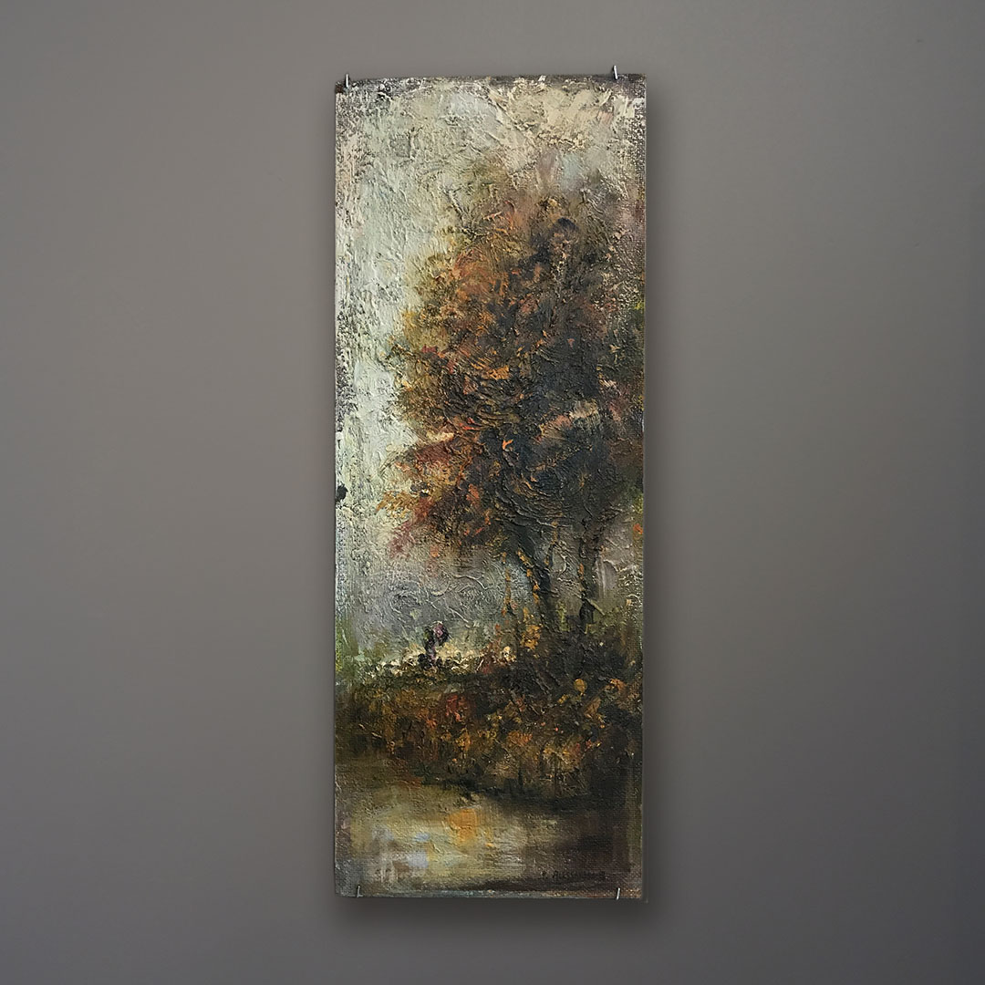 Offered here is a nearly abstract impressionistic painting of a rural scene. It is an oil painting on masonite. It is titled “Paysage Blanc.” Signed and dated “Avril 1967.” Painted in New Rochelle NY. 8 x 22 inches. Unframed.