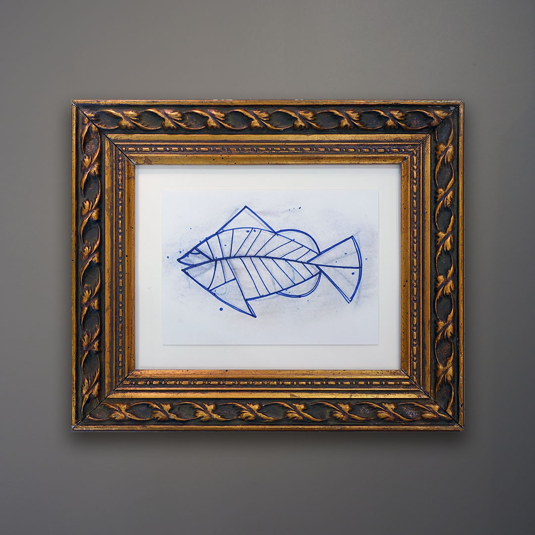 We acquired his works on paper including four large drawings of fish. We reproduced two of these drawings from our collection as a 5 x 7 inch lithograph of coated paper. It is framed in a gold gilt carved hardwood frame with an acrylic face.