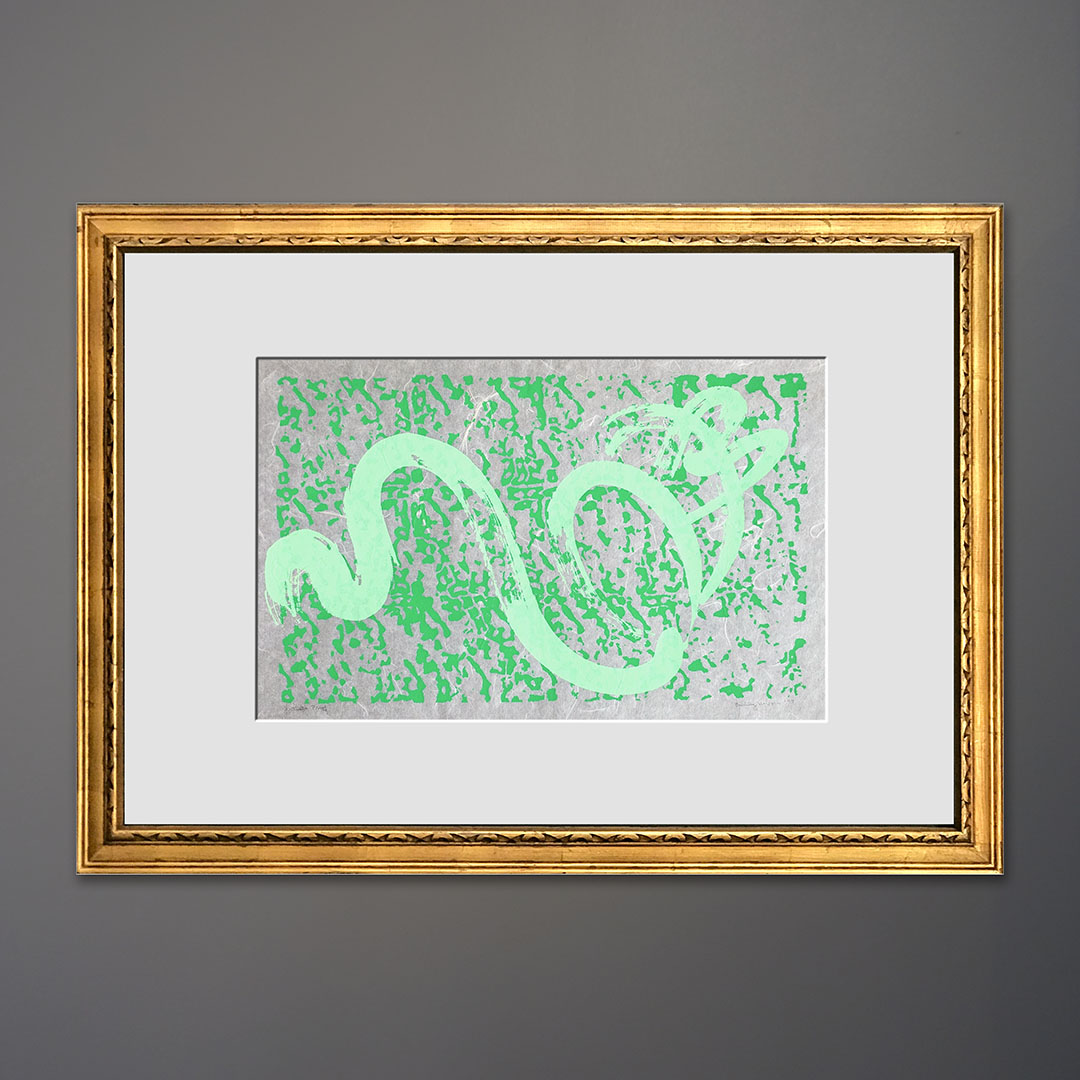Emily Earl Hixon aka Emily H. Sturkie aka Emily Hixon Taplin (1919-2003) was a prolific painter and printmaker working in both non-objective and Pop Art idioms. In 1974, she helped start the artist-run Amos Eno Gallery in New York City’s Soho District (it recently relocated to Bushwick, Brooklyn). She was an educator and an art director at Rutgers University. Her studio was on Shelter Island, a short ferry ride from our design shop here in Greenport, NY on the North Fork. We acquired a large set of her abstract works on paper. The image measures 17 x 26 inches and with the frame it measures 32 x 44 inches. It signed, Titled “Artist’s Proof,” and dated 1977. It is framed in a period-appropriate gold gilt hardwood frame with a museum acrylic face and an acid-free mat.