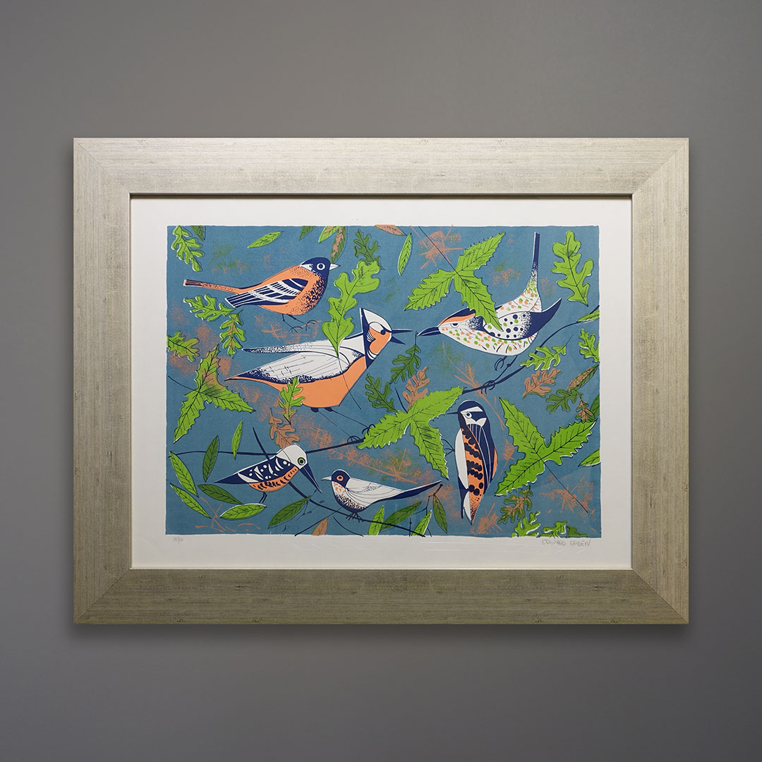 An undated Mid-Century Modern serigraph signed Edward Arden. This limited edition silkscreen print is in fine condition with bright, solid colors. Signed and marked with the edition number. It measures 24 x 30 inches as framed. Reminiscent of the work by Charlie Harper.