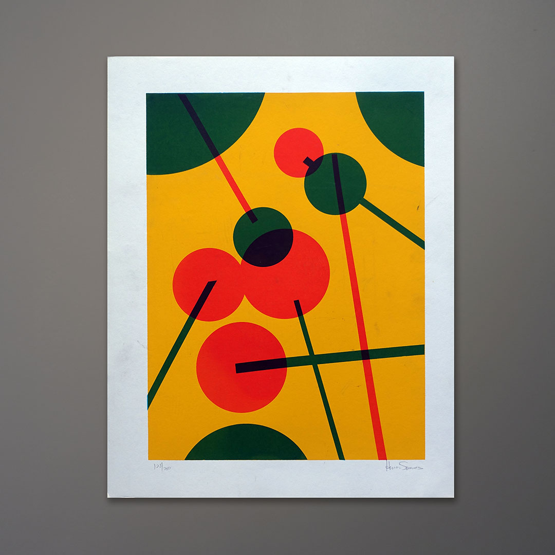 An undated Mid-Century Modern abstract serigraph signed Henri Sommes. This limited edition silkscreen print is in fine condition with bright solid colors and no foxing to the vintage paper its printed on. Signed and marked with the edition number. It measures 16 × 20 inches.