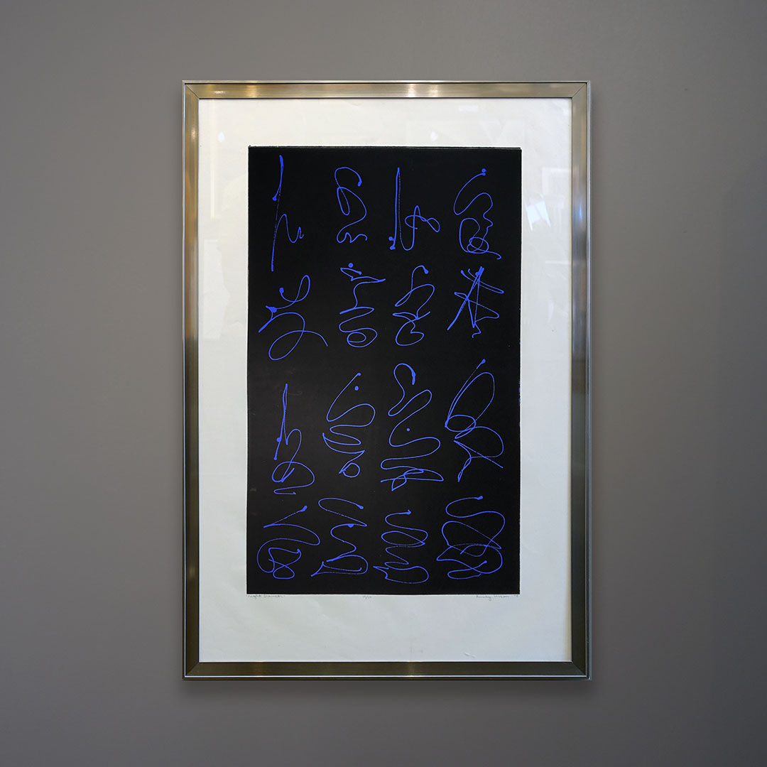 This serigraph is in rich black and bright blue ink on paper. 26 x 38 inches as framed. Signed, entitled “Night Dancer”, edition 10/10 and dated 1975. It is framed in a period-appropriate stainless steel frame with a museum glass face.