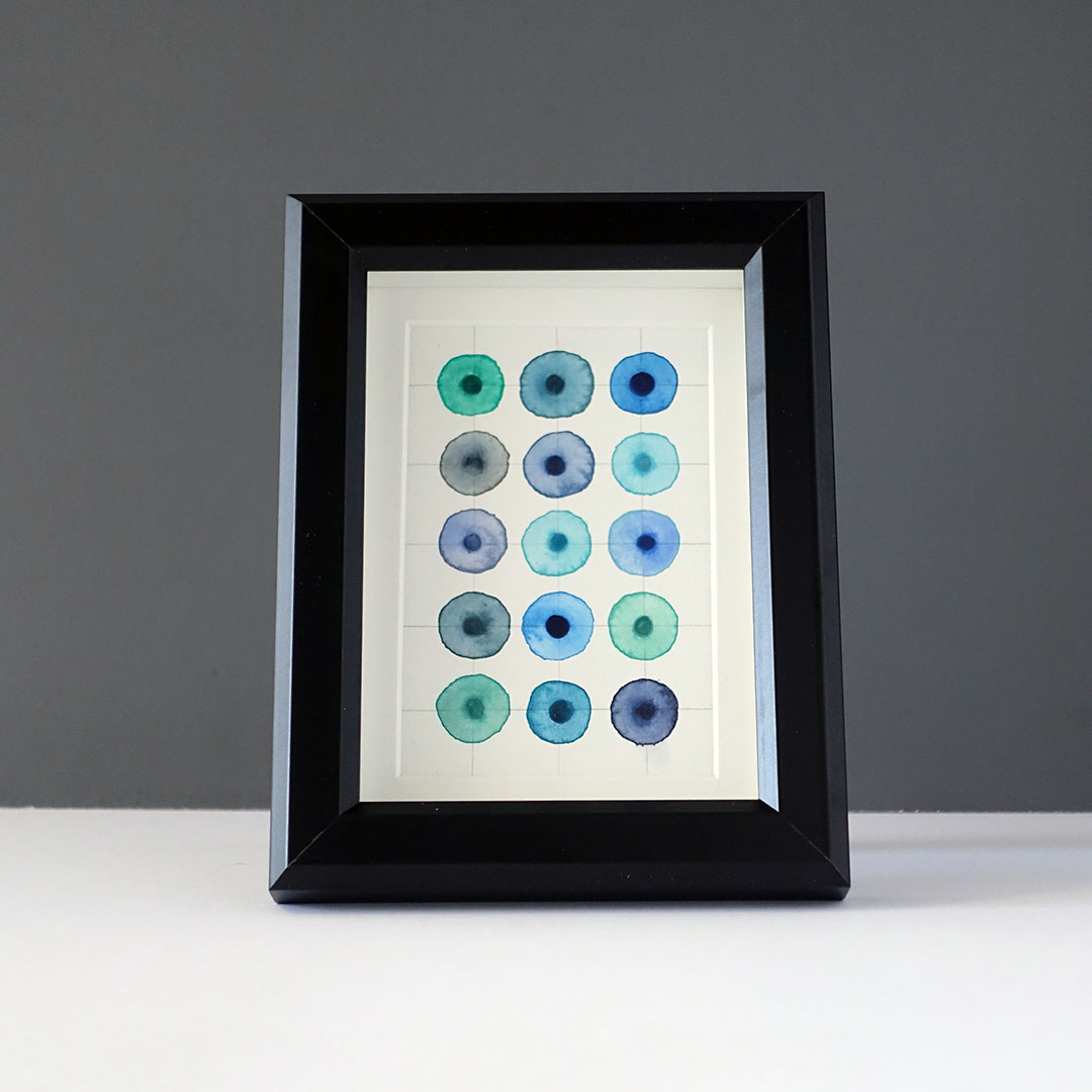 Leah Peeks 4×6 Gray Blue Dots Mat Frame. Made on Shelter Island by Leah Peeks, 2019. This is an original watercolor painting on heavy watercolor paper. It is framed in modern black wood shadow box. It measures 7 x 9 inches framed. It may be mounted in the horizontal or the vertical orientation. The artist, Leah Peeks, said it is up to the owner. This artwork is distinctive because of the way the pattern responds to the viewer’s eye. A sense of movement, an awareness of the near-perfect but also not-perfect design.