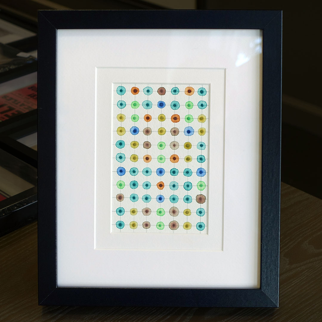 Leah Peeks 4×6 Colorful Dots Double Mat Frame. Made on Shelter Island by Leah Peeks, 2019. This is an original watercolor painting on heavy watercolor paper. It is framed in modern black wood frame with a double mat. It measures 9 x 11 inches framed. It may be mounted in the horizontal or the vertical orientation. The artist, Leah Peeks, said it is up to the owner. This artwork is distinctive because of the way the pattern responds to the viewer’s eye. A sense of movement, an awareness of the near-perfect but also not-perfect design.