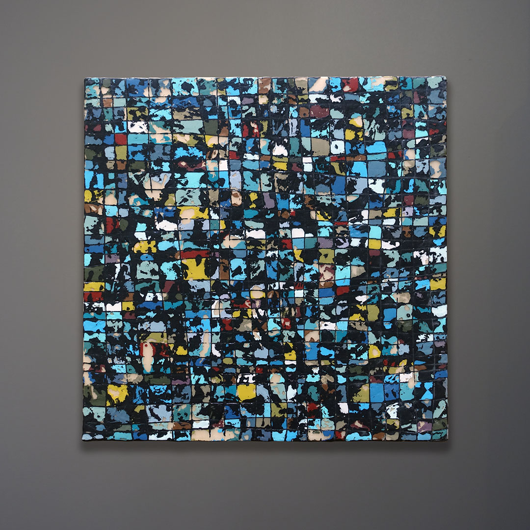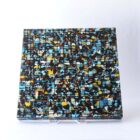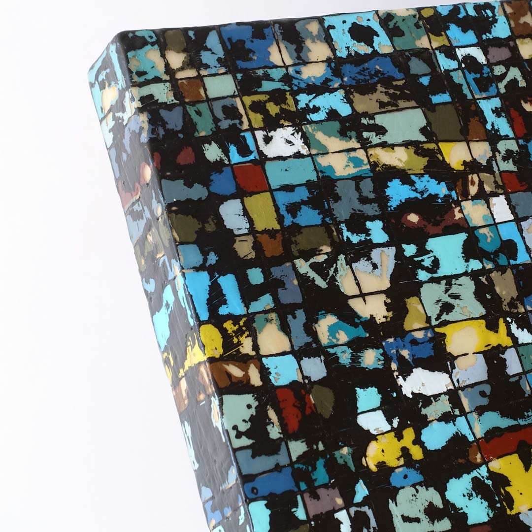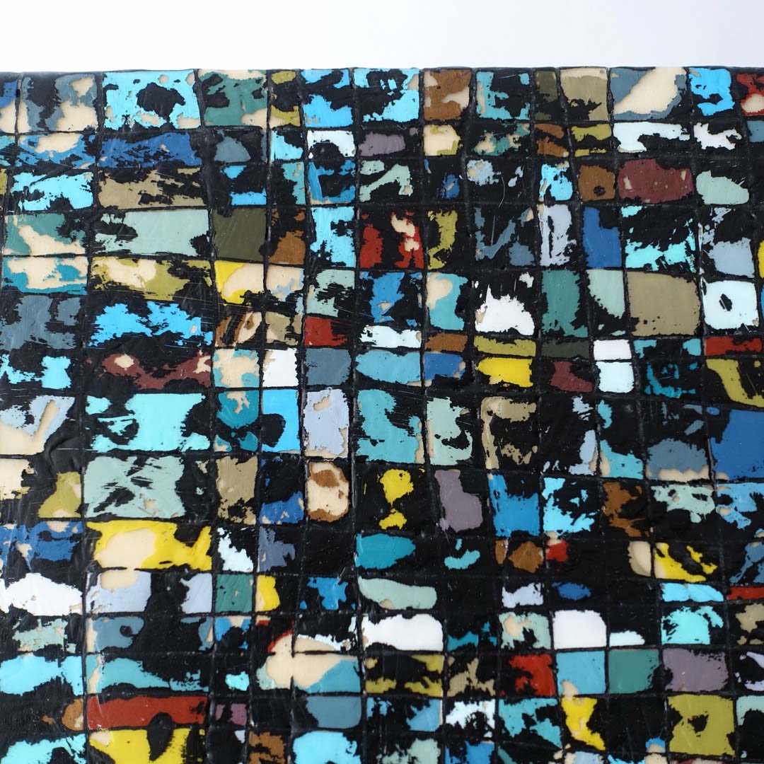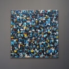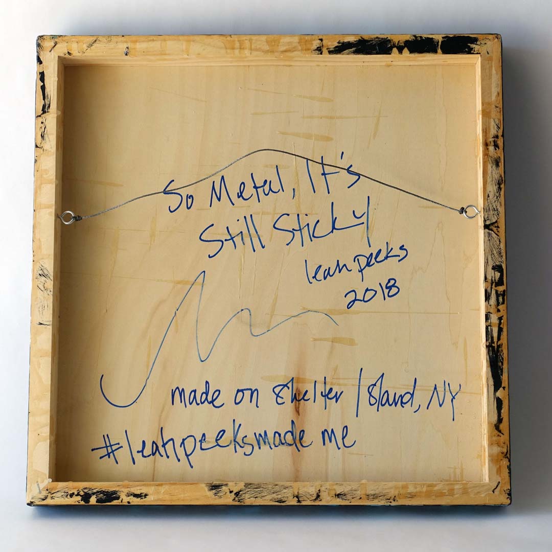 Leah Peeks 16 x 16 Original Painting. Made on Shelter Island by Leah Peeks, 2018 after several sojourns to Manhattan for inspiration. The title is “So metal, it’s still sticky.” Signed, dated, and titled on the verso. This is an original wax and acrylic painting on wood. It measures 16 x 16 inches and is unframed as the art wraps the sides. There are deeply incised markings and scrape aways that reveal layer upon layer of color and wax. This painting took over a week to produce due to the complex layering technique.