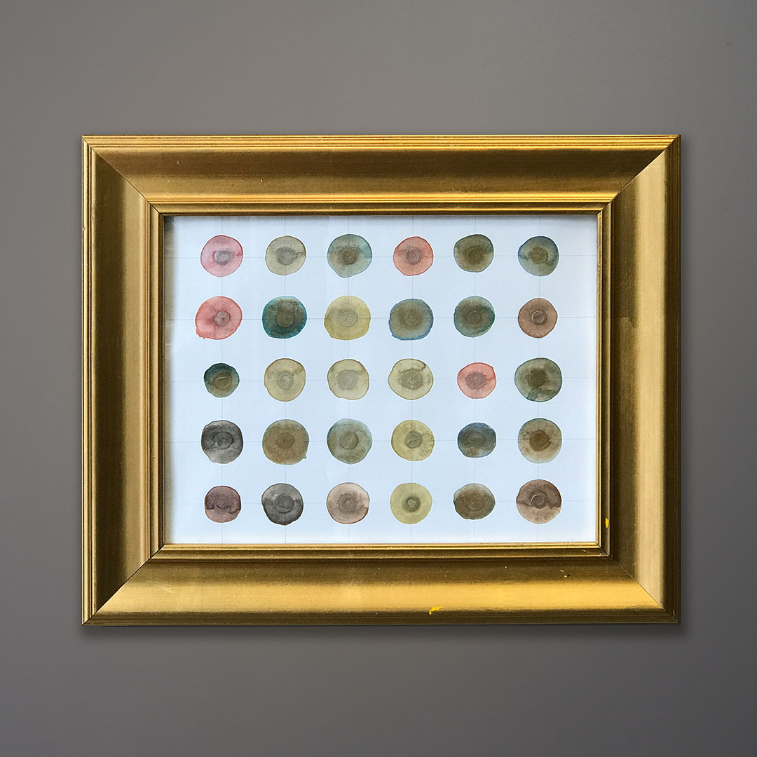 Original art by Leah Peeks, Shelter Island, NY, 2019. This artwork is distinctive because of the way the pattern responds to the viewer’s eye. A sense of movement, an awareness of the near-perfect but also not-perfect design. This is an original watercolor painting on heavy watercolor paper. It is framed in a vintage gold leaf frame. It measures 16 x 19 inches framed. It may be mounted in the horizontal or the vertical orientation.