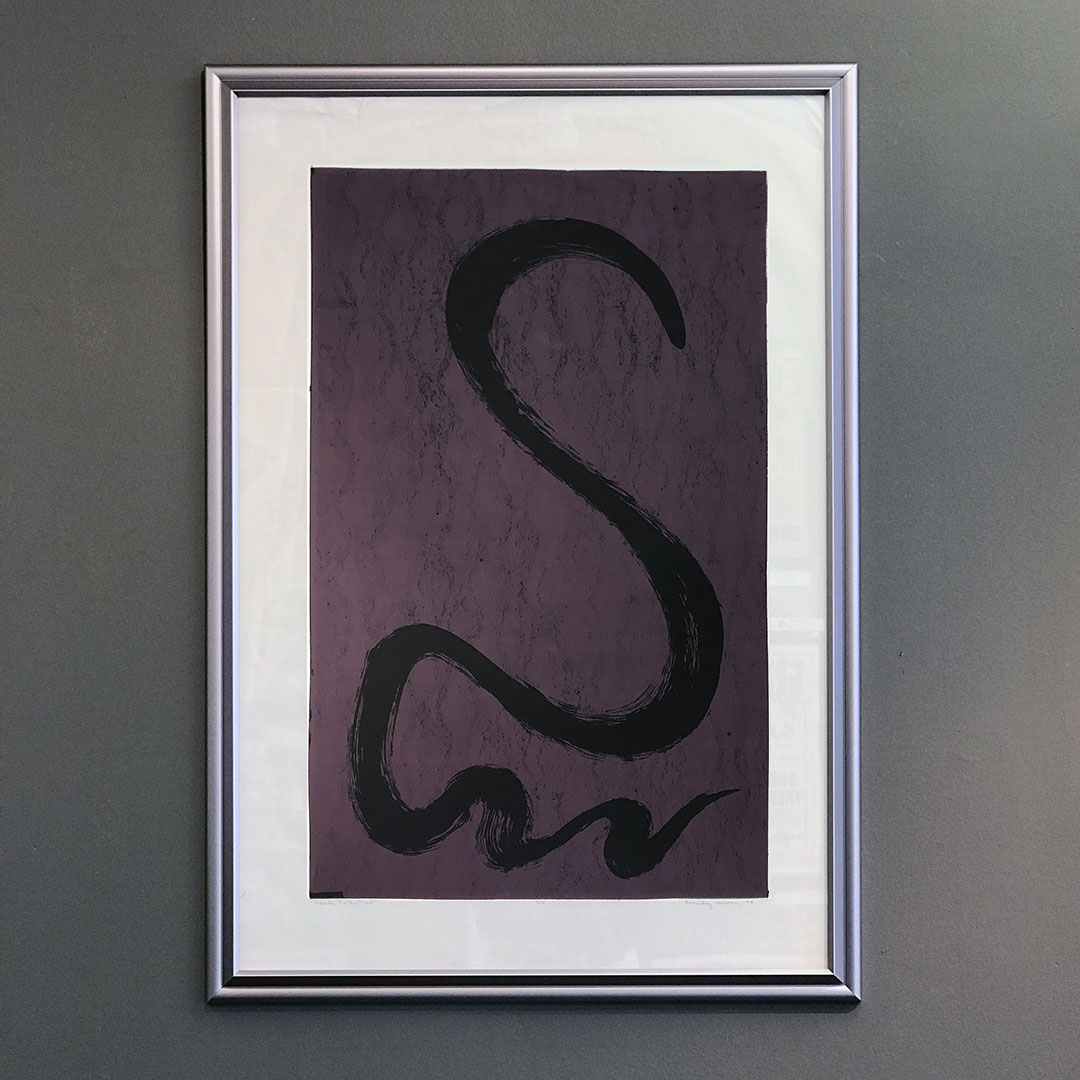 We acquired a large set of her abstract works on paper. They are quite large. This original serigraph is in rich ink on printmaker’s paper. It measures 26 x 37 inches as framed. It signed, numbered 4/5, entitled “Dark Influence,” and dated 1975. It is framed in an aluminum frame with a glass face.