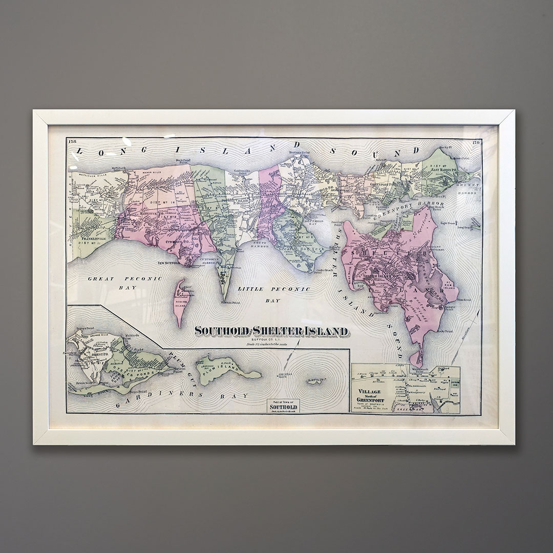 Published in 1873 by F. W. Beers Atlas of Long Island New York. Very detailed artwork that included landmarks, roads, streets and the names of property holders. Offered here is a gallery-quality archival pigment print on 100% cotton paper, in a modern white wood wood frame 17 x 25 inches. The original map was hand-colored to indicate the Village boundaries. Towns depicted are Franklinville, Mattituck, Peconic, Southold, Greenport, East Marion, Orient, Oysterponds, Robins Island, Plum Island, Shelter Island—all along Peconic Bay with Long Island Sound to the North.