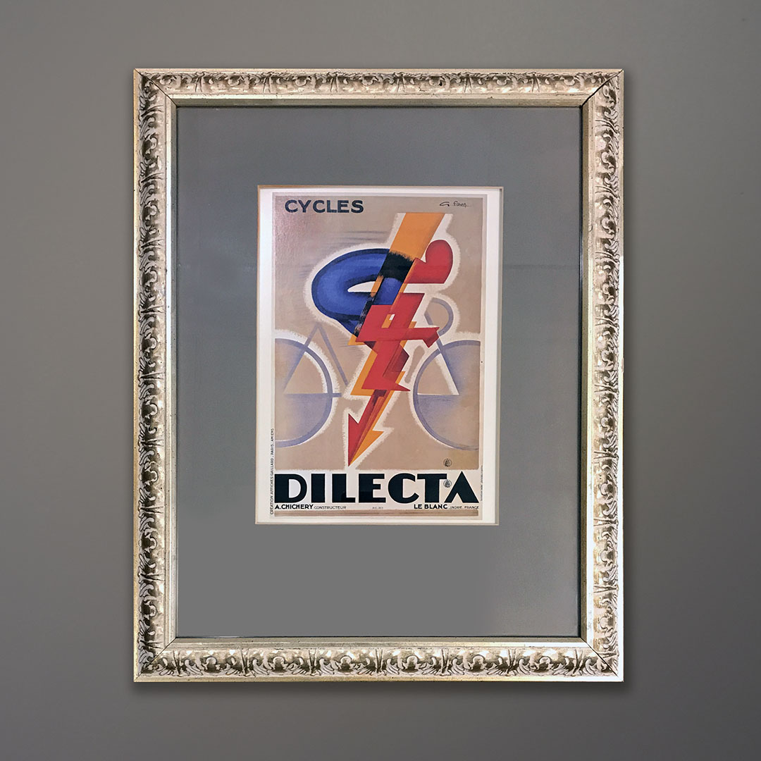 Offered here is a reduced scale offset reproduction of the famous Georges Favré Cycles Dilecta 1928 poster. Blue and yellow are the colors of the jerseys worn by the Dilecta-Wolber racing team combined with the French flag tricolore. Brilliant design featuring elements of Futurism, Vorticism, and Cubism to emphasize speed and Machine Age engineering excellence. We present it here in a gray mat with a vintage gold and white gilt wood frame with a glass face. Overall size is 20 x 24 inches.