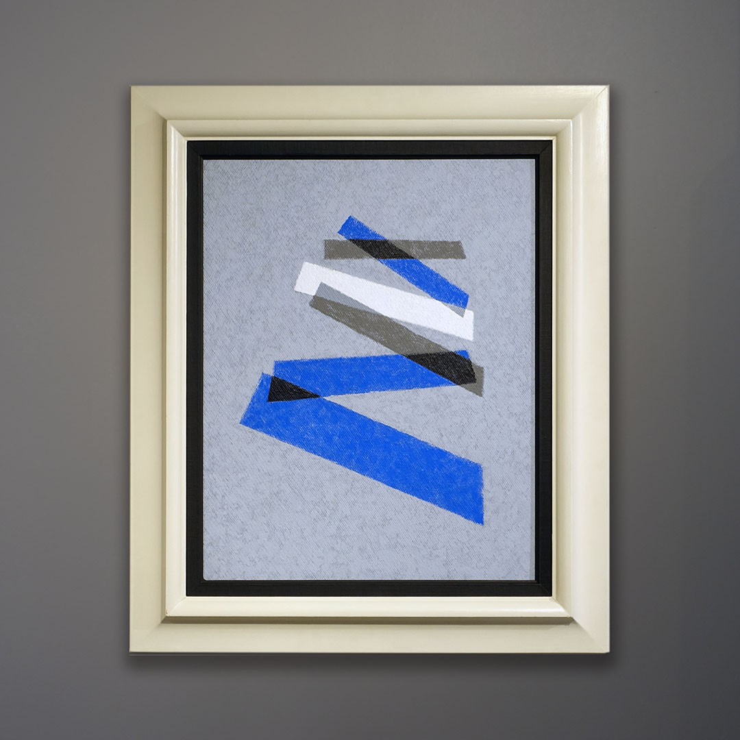 This contemporary abstract acrylic painting on linen was inspired by a happy accident in the studio: some scrap cardboard strips were sitting in a pile on top of a larger board. By Michael Aron, 2019, titled “Blue Blue-Gray.” This original painting is in a 24 × 30 inch vintage German hardwood frame.