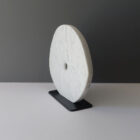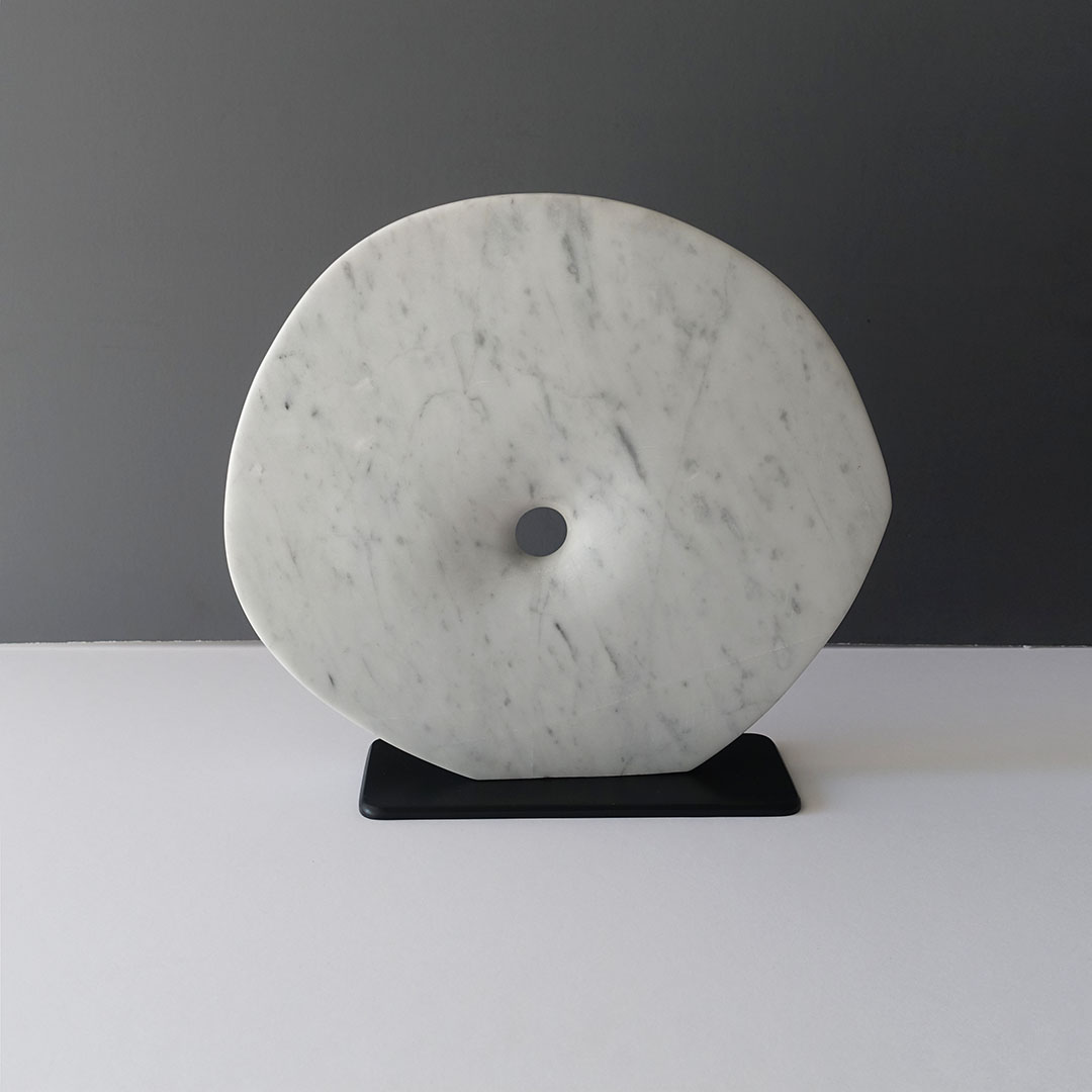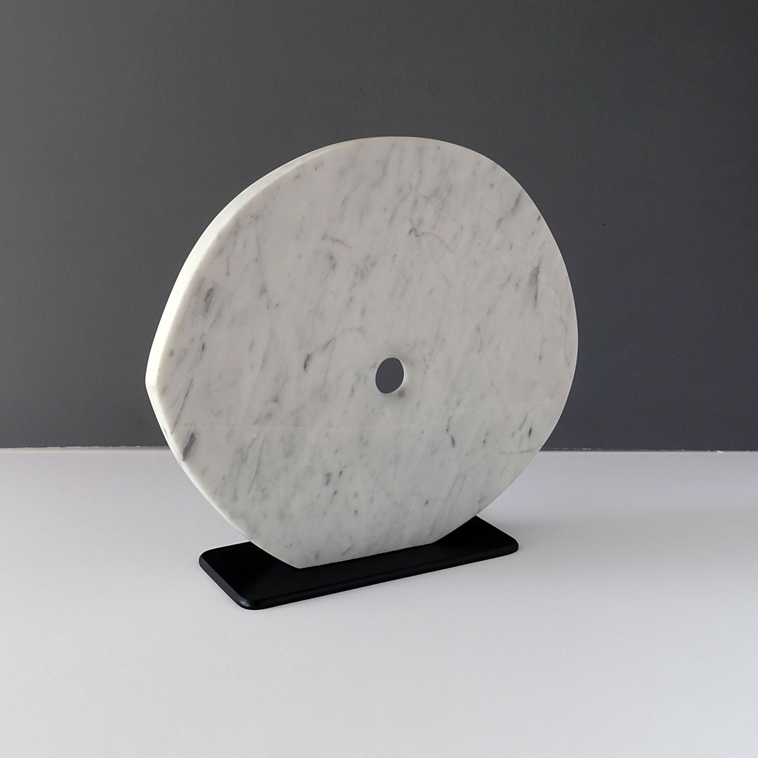 Mike McClellan is an artist residing in both California and here on Shelter Island. His forms are characterized by bold, sweeping forms, innovative use of colored stone, and the edgy balance between the weight of the rock and the air that flows through and around the negative spaces in his shapes. His influences are Brancusi, Arp, Moore and Noguchi. This piece is made from a solid block of Carrera marble and post-mounted to a removable minimalist black granite base. It measures 12 x 14 x 1.75 inches.