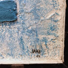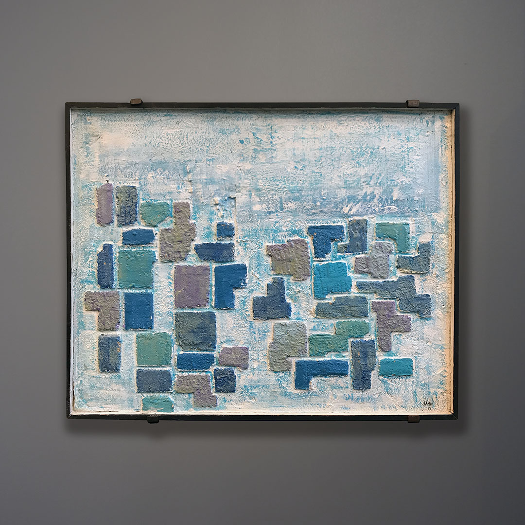 Offered here is an unusual and impressive Mid-Century Modern relief painting signed Jama, dated 1966, and titled on the back “Vacances.” The surface of the work is in dimensional relief made from a sandy cement-like material, then painted in shades of blue, green and gray. It measures 22 x 28 inches and is in its original ebony frame with a cast iron grid to support the weight when the artwork is installed.