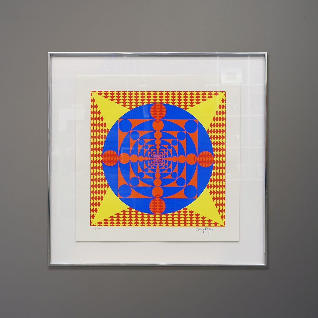 An undated Op-Art serigraph signed Henry Rogers. This limited edition silkscreen print is is fine condition with bright solid colors and no foxing to the vintage paper its printed on. Circa 1960-1970. Signed and marked 29/200. This print float mounted on archival board in a modern polished aluminum frame with a museum glass face. It measures 24 x 24 in the frame. This composition is clearly an homage to Vasarely.