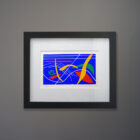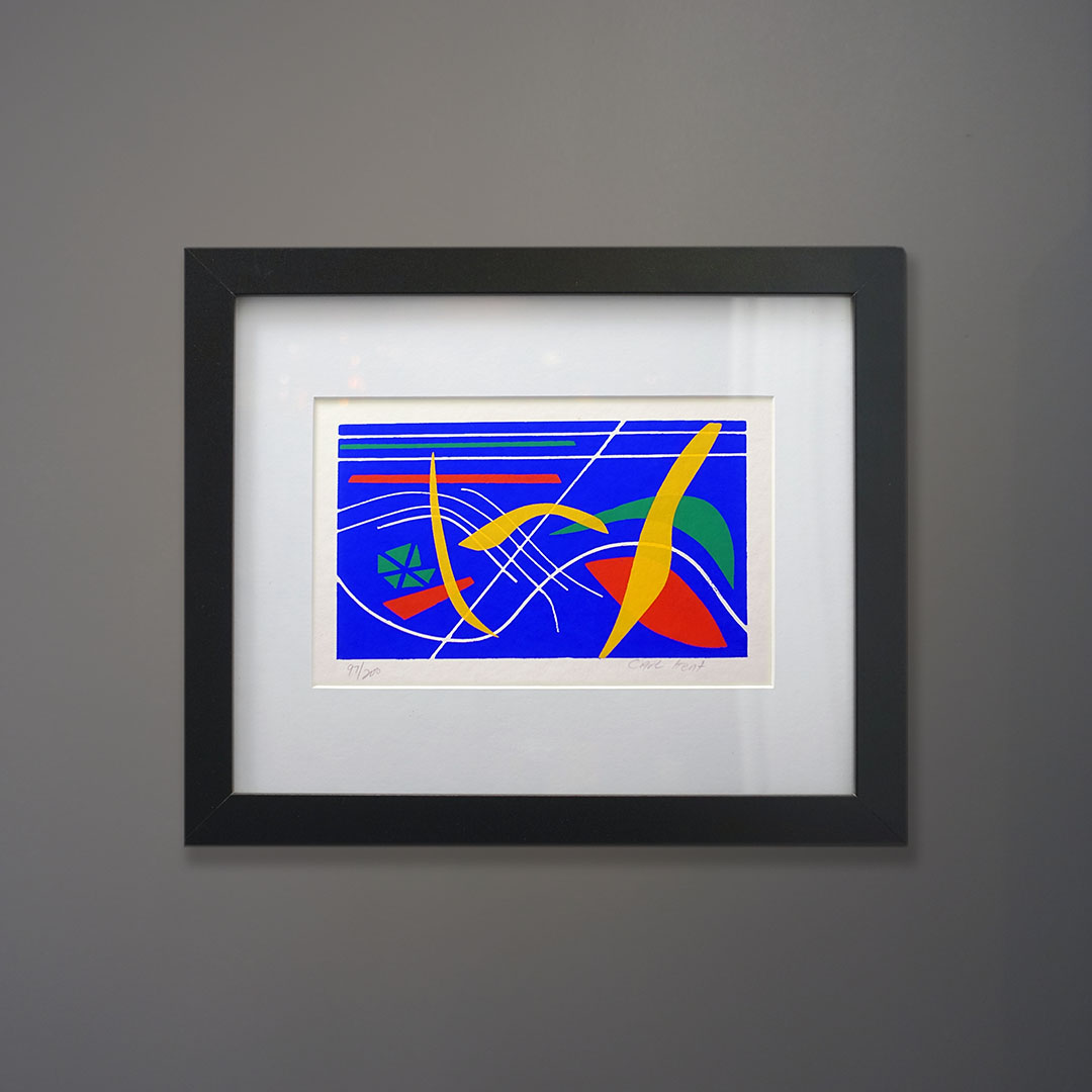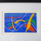 An undated abstract serigraph signed Carl Kent. This limited edition silkscreen print is in fine condition with bright solid colors and no foxing to the vintage paper its printed on. Dates from the Mid-Century. Signed and marked 97/200. This print is a modern black frame, matted, with a museum glass face. It measures 10×12 in the frame. Kent was a New Jersey artist who printed this under the supervision of the surrealist Leo Russell at his atelier. Russell was a NY/NJ artist and educator beginning his career teaching in the WPA program. Russell has work in the permanent collection of the Guggenheim.