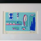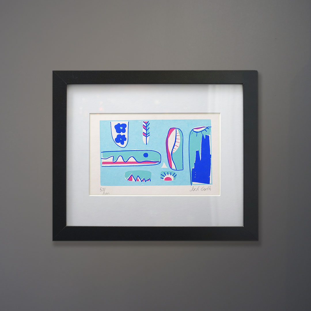 An undated abstract serigraph signed Jack Garth. This limited edition silkscreen print is in fine condition with bright solid colors and no foxing to the vintage paper its printed on. Dates from the Mid-Century. Signed and marked 53/200. This print is a modern black frame, matted, with a museum glass face. It measures 10×12 in the frame. Garth was a New Jersey artist who printed this under the supervision of the surrealist Leo Russell at his atelier. Russell was a NY/NJ artist and educator beginning his career teaching in the WPA program. Russell has work in the permanent collection of the Guggenheim.