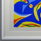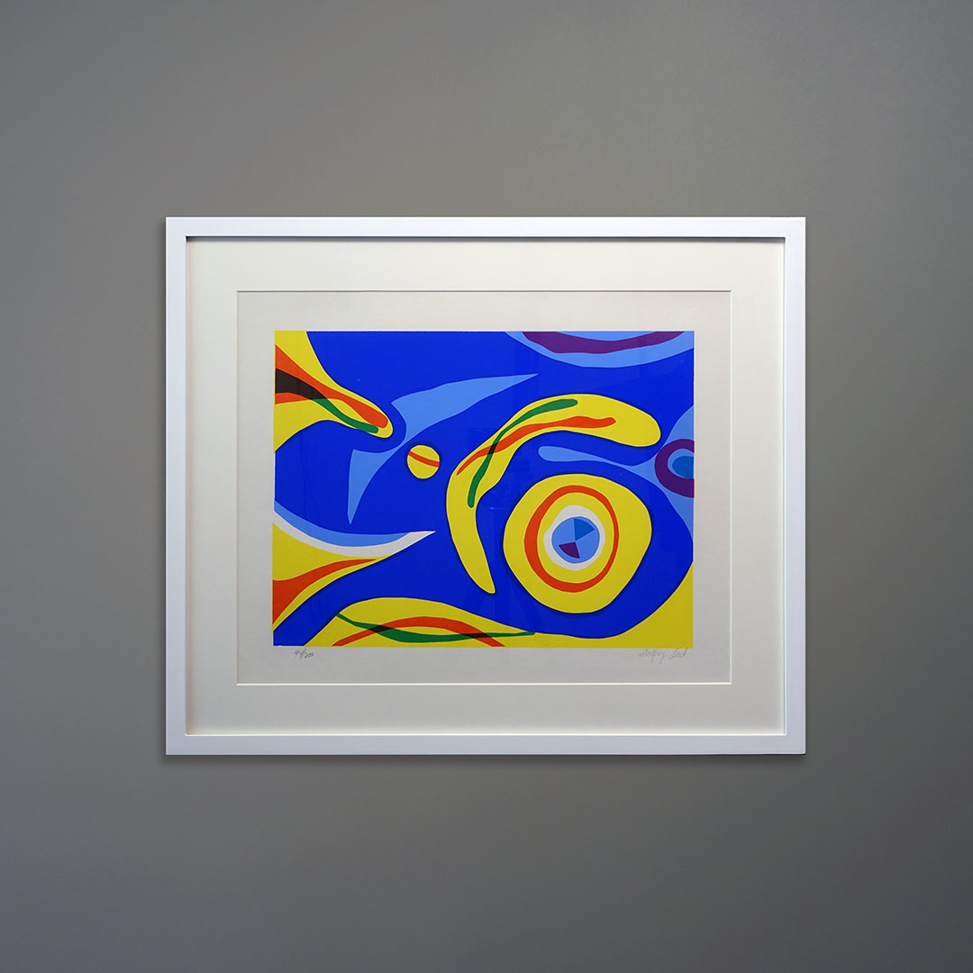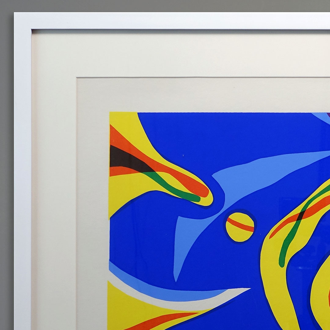 An undated Mid-Century Modern abstract serigraph signed Godfrey Leed. This limited edition silkscreen print is in fine condition with bright solid colors and no foxing to the vintage paper its printed on. Signed and marked with the edition number. It measures 21×27 inches as framed in matte white wood with a glass face. This work is reminiscent of Matisse or Braque.