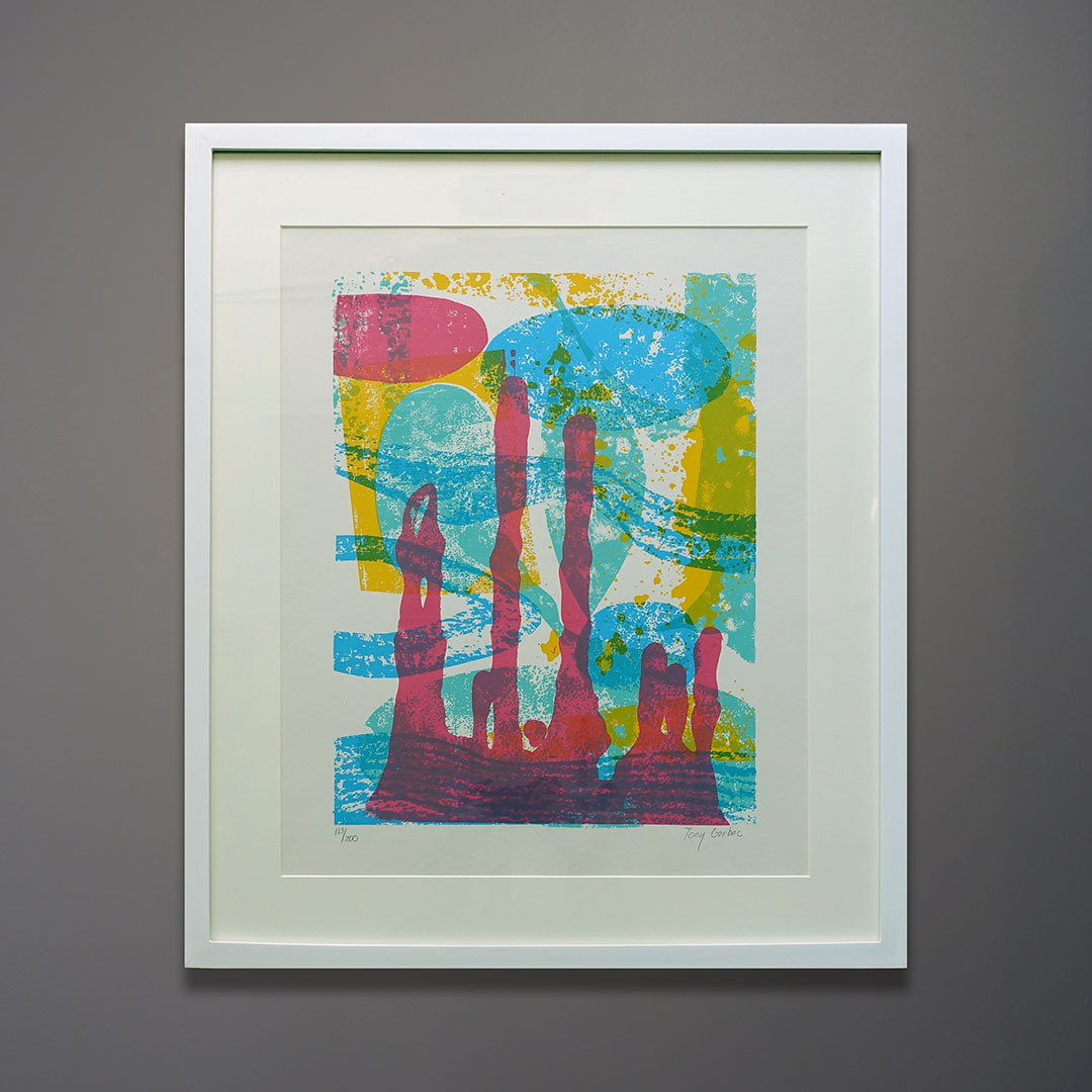 A Mid-Century Modern abstract screen print signed Tony Garboc. This limited edition silkscreen print is in fine condition with bright solid colors and no foxing to the vintage paper its printed on. Signed and marked with the edition number. 21×26 inches framed in white with glass and acid-free mat.