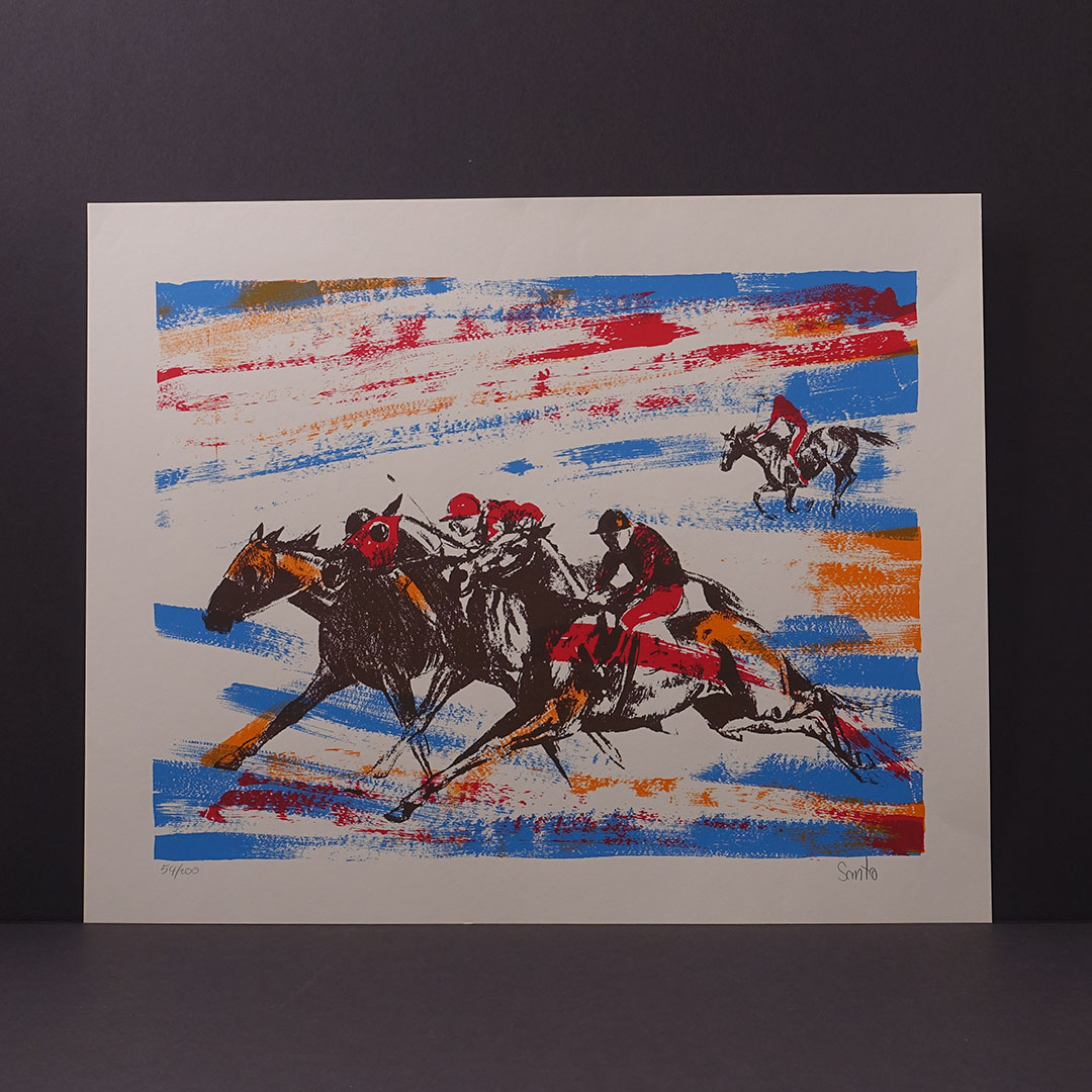 An undated Mid-Century Modern expressionist serigraph signed Santo. This limited edition silkscreen print is in fine condition with bright, solid colors. Signed and marked with the edition number. It measures 16 × 20 inches.
