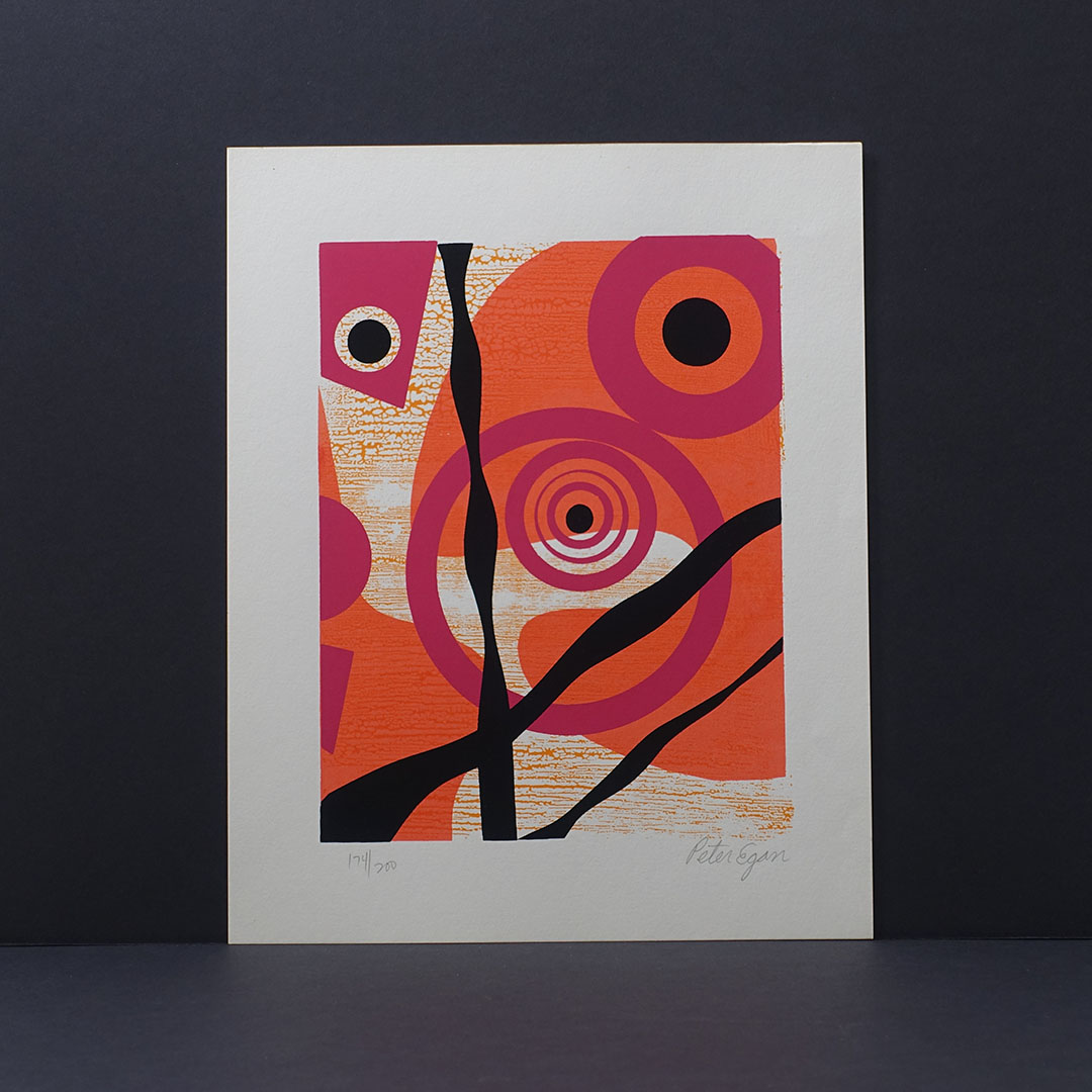An undated Mid-Century Modern abstract serigraph signed Peter Egan. This limited edition silkscreen print is in fine condition with bright, solid colors. Signed and marked with the edition number. It measures 14 x 17 inches.
