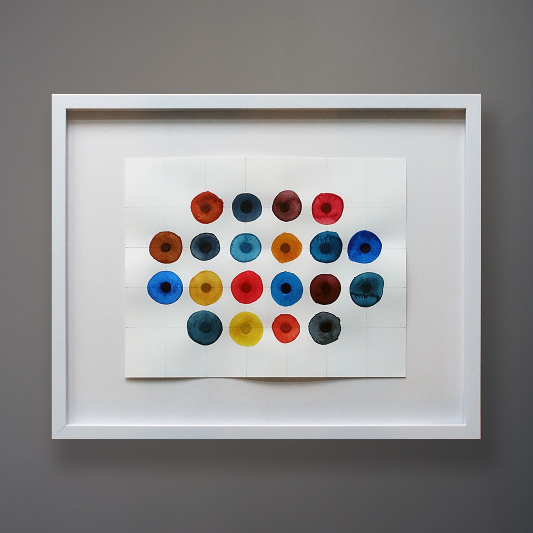 This artwork is distinctive because of the way the pattern responds to the viewer’s eye. A sense of movement, an awareness of the near-perfect but also not-perfect design. This is an original watercolor painting on heavy watercolor paper. It is float framed in white and has a museum glass face. It measures 17 x 22 inches framed. It may be mounted in the horizontal orientation too. The artist, Leah Peeks, is from Shelter Island, NY—not far from our shop.