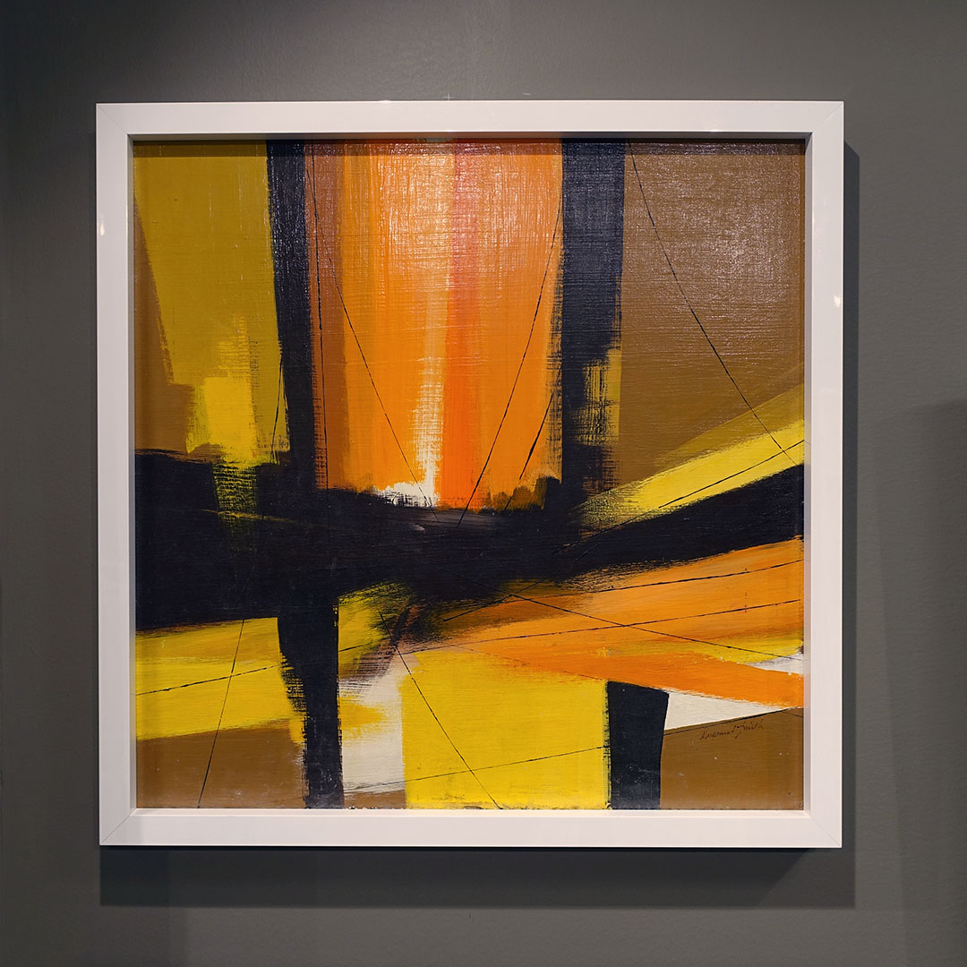 We fell hard for the confident brush work in this abstract oil painting on masonite. It is a fine example from the period. Figurative, yes, but not overtly so. Signed lower right Virginia D. Smith. She is a mystery. The work is also signed and titled on the verso “Virginia D. Smith / Manhattan & Her Bridges.” 24 × 24 inches as custom framed in a high gloss white wood.