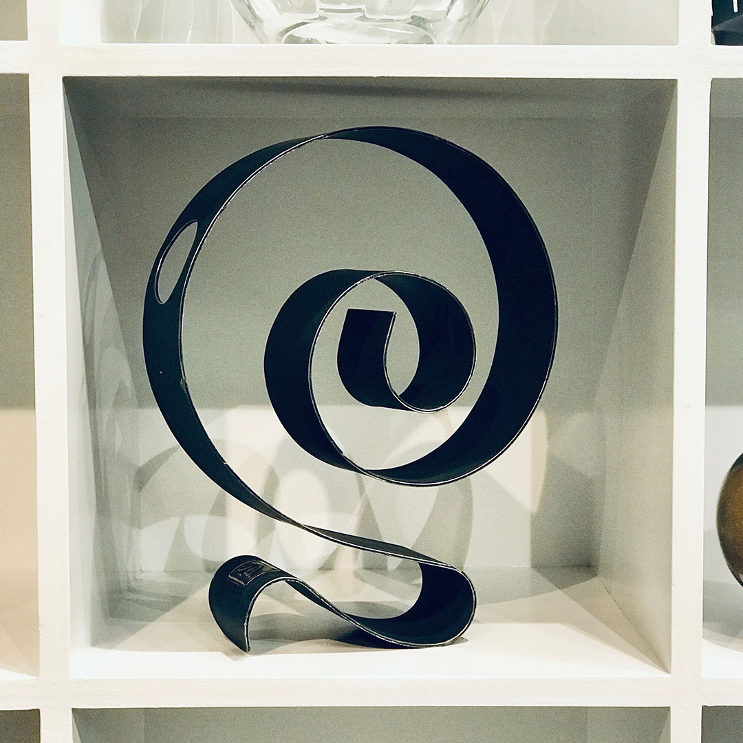 Offered here is a signed Mid-Century Modern style steel ribbon sculpture that has a pleasing kinetic action. Due to the curl of the steel, if touched, it bobs for longer than you’d think. A great coffee table conversation piece. It is signed JD, a mystery artist. It can be displayed in vertical or horizontal orientation. It is 14½” h × 10″ w × 7″ d.