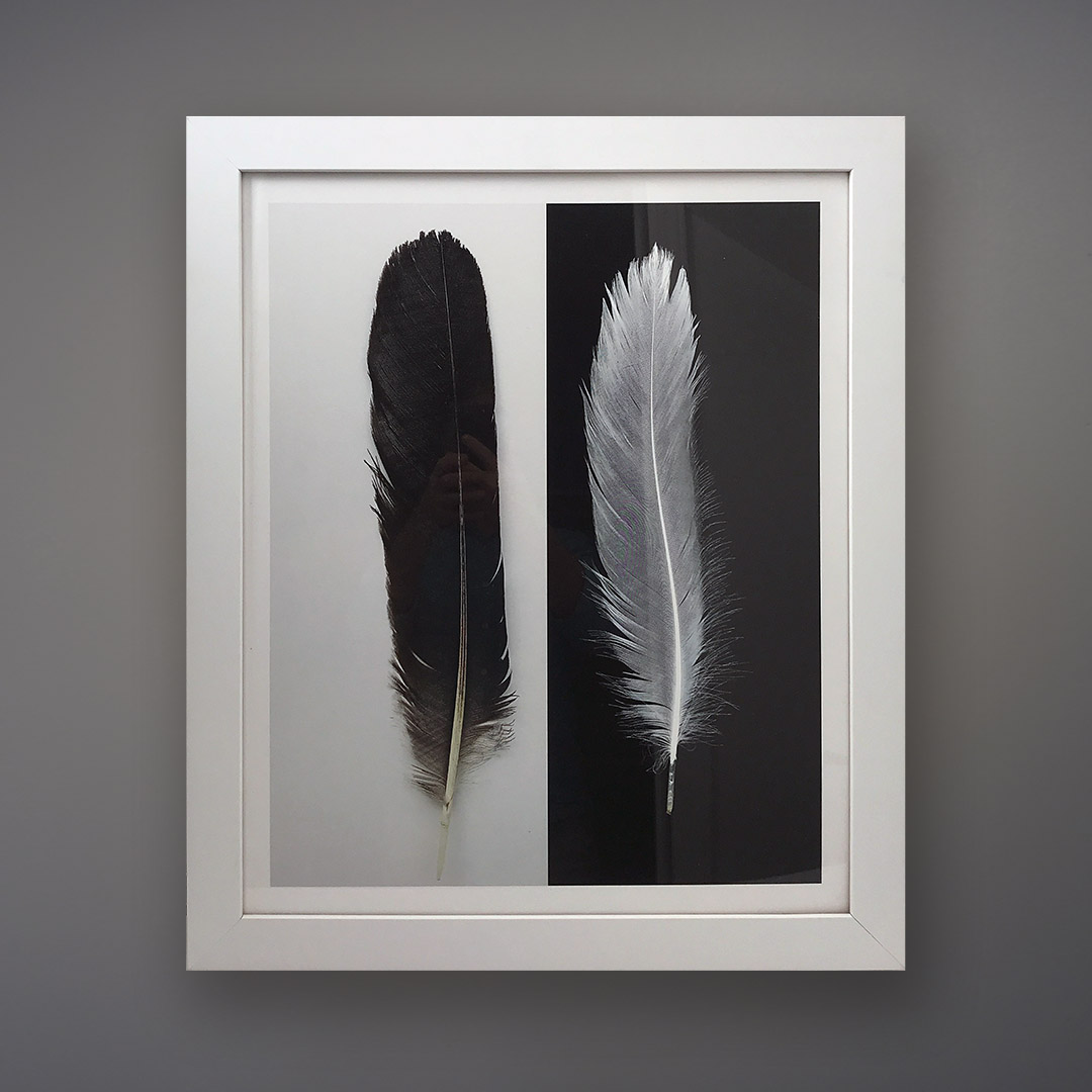 Macro photograph of two gull feathers found on 67 Steps Beach in Greenport. Custom framed in white wood with a gallery acrylic face. 22 x 26 inches as framed. Other sizes available. By Michael Aron.